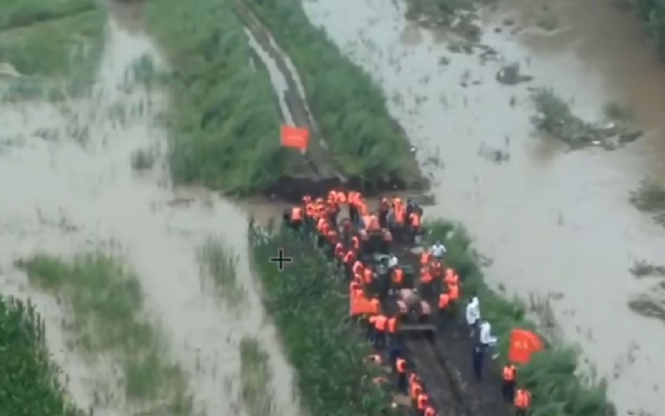 现场视频显示,一河段水流湍急,有四五名工作人员身穿救生衣站在齐腰深的水中,用锤子捶打木桩。另一段现场视频中,有田地被淹没,多名消防救援人员正在对决口进行封堵。