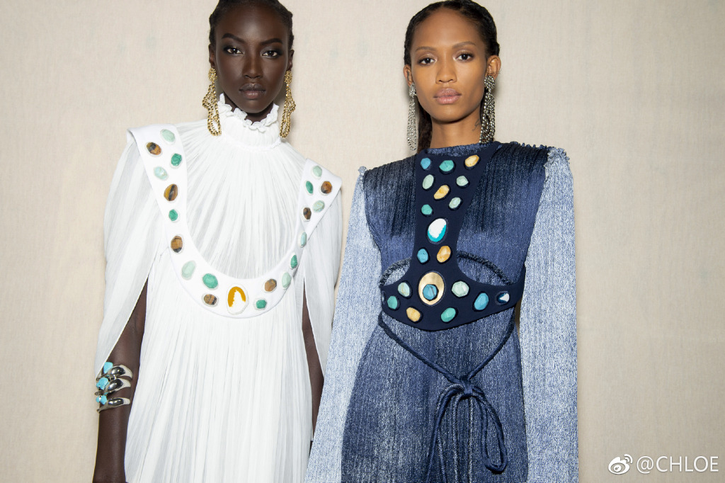Chloe 2019春夏系列时装秀幕后花絮中,模特演绎衬衫裙单品。图/Chloe官方微博截图
