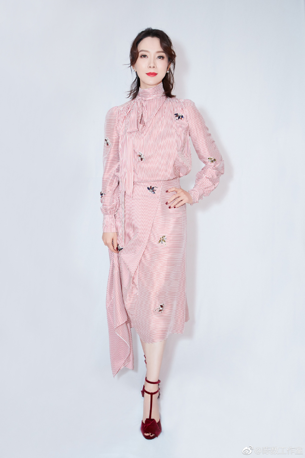 陈数身着Erdem红色条纹衬衫裙出席某杂志时尚活动。图/陈数工作室微博截图