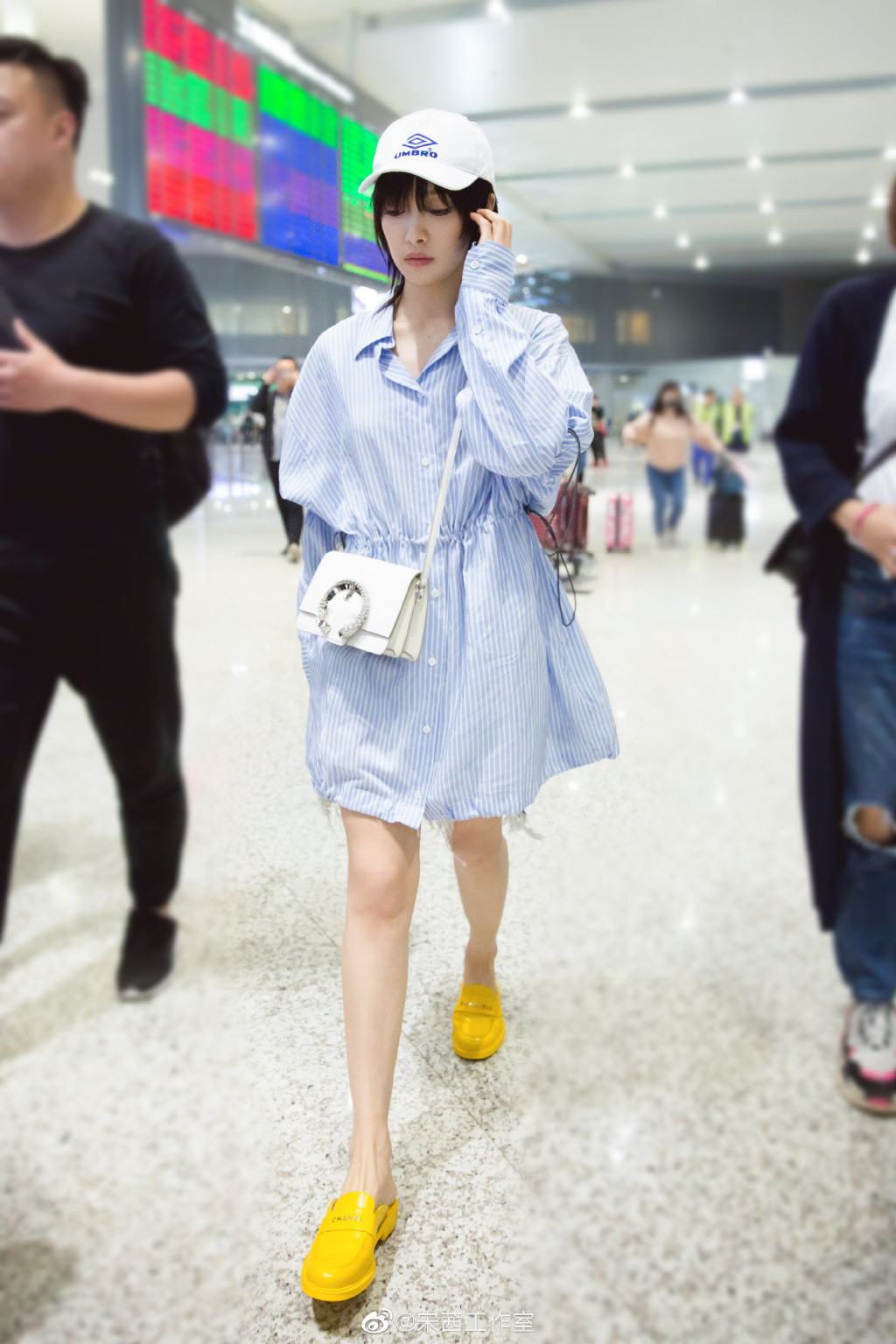 宋茜近期机场街拍中,以蓝白条纹衬衫搭配亮黄漆皮鞋,更增添清新可爱。