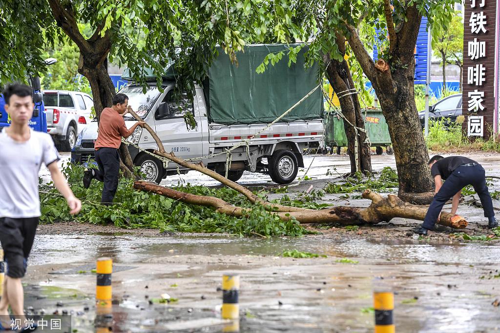8月1日,在海口市滨涯路,民众清理被大风吹断的树枝。图/骆云飞(海南分社)/中新社/视觉中国