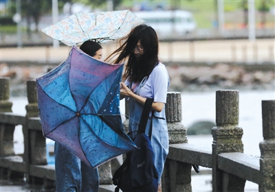 7月31日,珠海,市民的伞被吹“翻折”。图/视觉中国