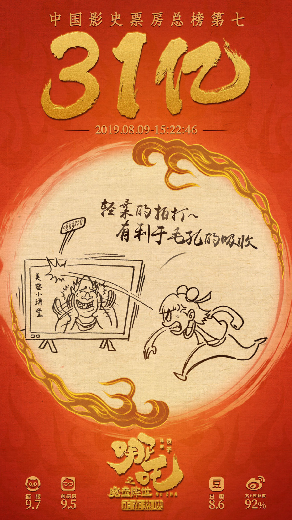 新京报讯 8月9日下午,据猫眼数据显示,《哪吒之魔童降世》综合票房在15点22分突破31亿元,正式超越《我不是药神》,升至中国影史票房总榜第七位。而几乎在同一时点,《哪吒》的单日票房也反超刚刚上映的《上海堡垒》,重夺单日票房榜冠军宝座。