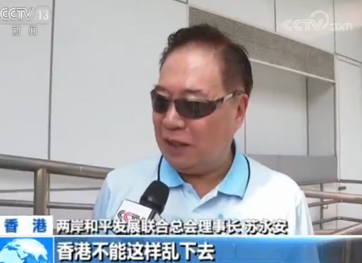 两岸和平发展联合总会理事长苏永安:香港不能这样乱下去,因为最终得益的不是香港人,香港人会集体遭殃,我们觉得必须是要止暴制乱,然后我们要支持警察。