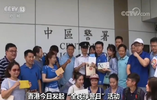 据央视新闻报道 香港多地今天(10日)发起“全民撑警日”活动。上午,几百名香港市民自发前往香港中区警署,向在一线工作的警察表示慰问。市民们表示,香港必须要止暴制乱,民众支持警察严正执法,打击暴徒嚣张气焰,尽快恢复社会安定。