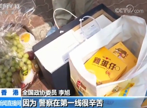 全国政协委员李旭:我们今天带了水果、巧克力、饼干、鸡蛋仔,因为警察在第一线很辛苦,有的时候战斗几个钟头都没有吃,没有喝。因为中央有了明确的指示,我们全香港的人也分清了是非,一定会全力撑警,支持警察,支持特首。