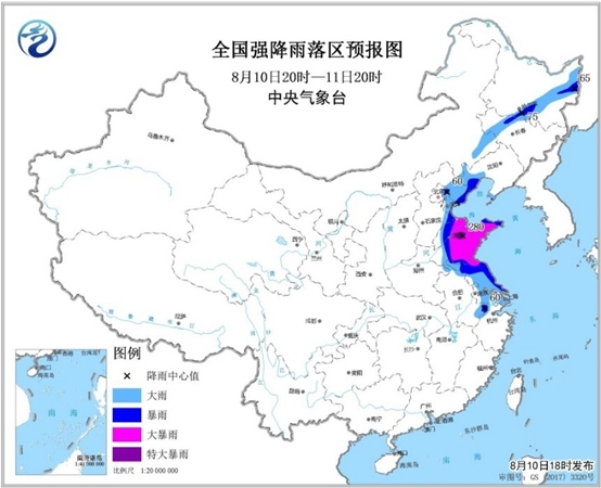 预计,8月10日20时至11日20时,浙江北部、上海、安徽东部、江苏、山东、河北东部、天津、北京东部、辽宁南部等地有大到暴雨,其中,江苏北部、山东大部等地的部分地区有大暴雨,山东中部局地有特大暴雨(250~280毫米)。此外,吉林西部、黑龙江中东部等地有大雨或暴雨。上述部分地区伴有短时强降水(最大小时降雨量20~50毫米,局地可达60毫米以上),局地有雷暴大风等强对流天气。