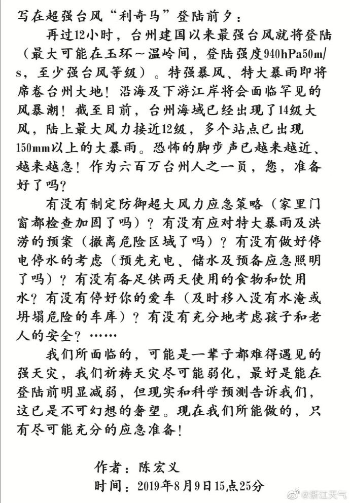 早在“利奇马”登陆前十个多小时,8月9日15时25分,台州市气象局原副局长、台风专家陈宏义给台州人民写了一封信。