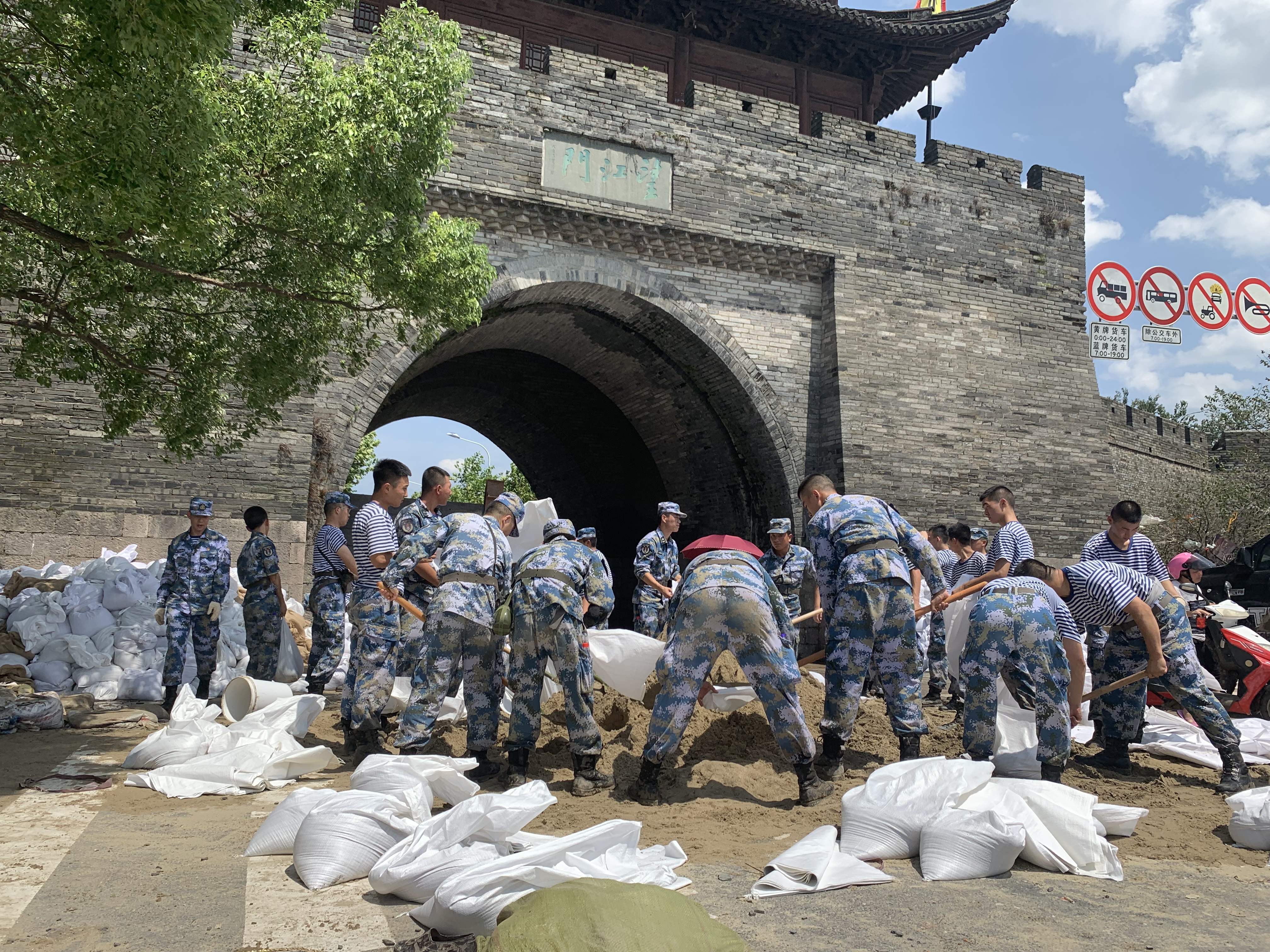 望江门被水流冲刷的痕迹仍清晰可见,红色的铁门现靠支架和沙袋支撑着。上述指战员介绍,此次加固沙袋,是防止因降雨、上游分洪等因素涨水,水再灌入城内。