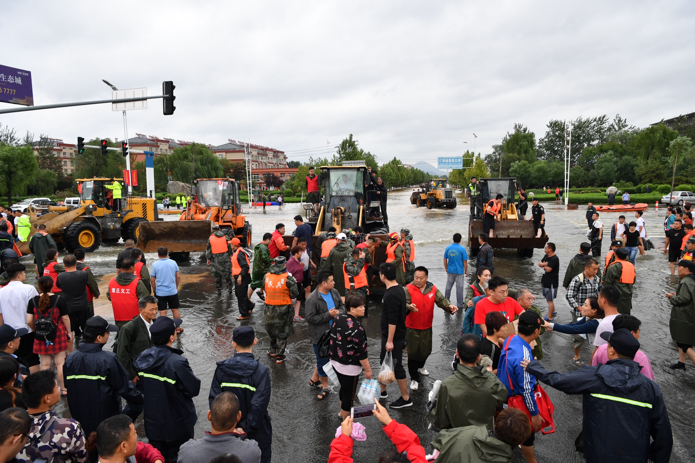 8月12日下午,章丘区相公庄街道,多支救援队伍合作展开救援。 新京报记者 吴江 摄