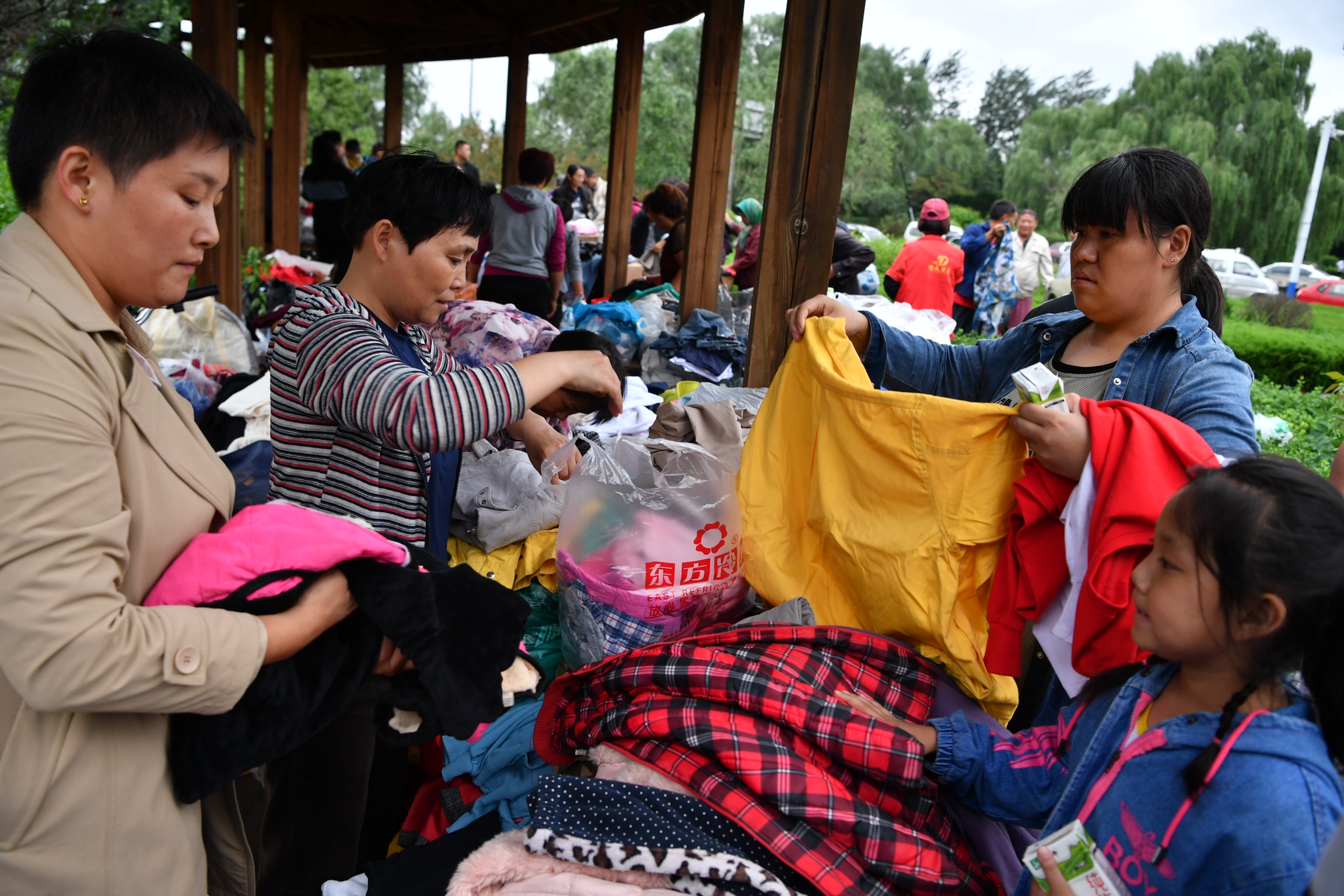 8月12日下午,章丘区相公庄街道,志愿者给受灾群众免费发放衣物。 新京报记者 吴江 摄