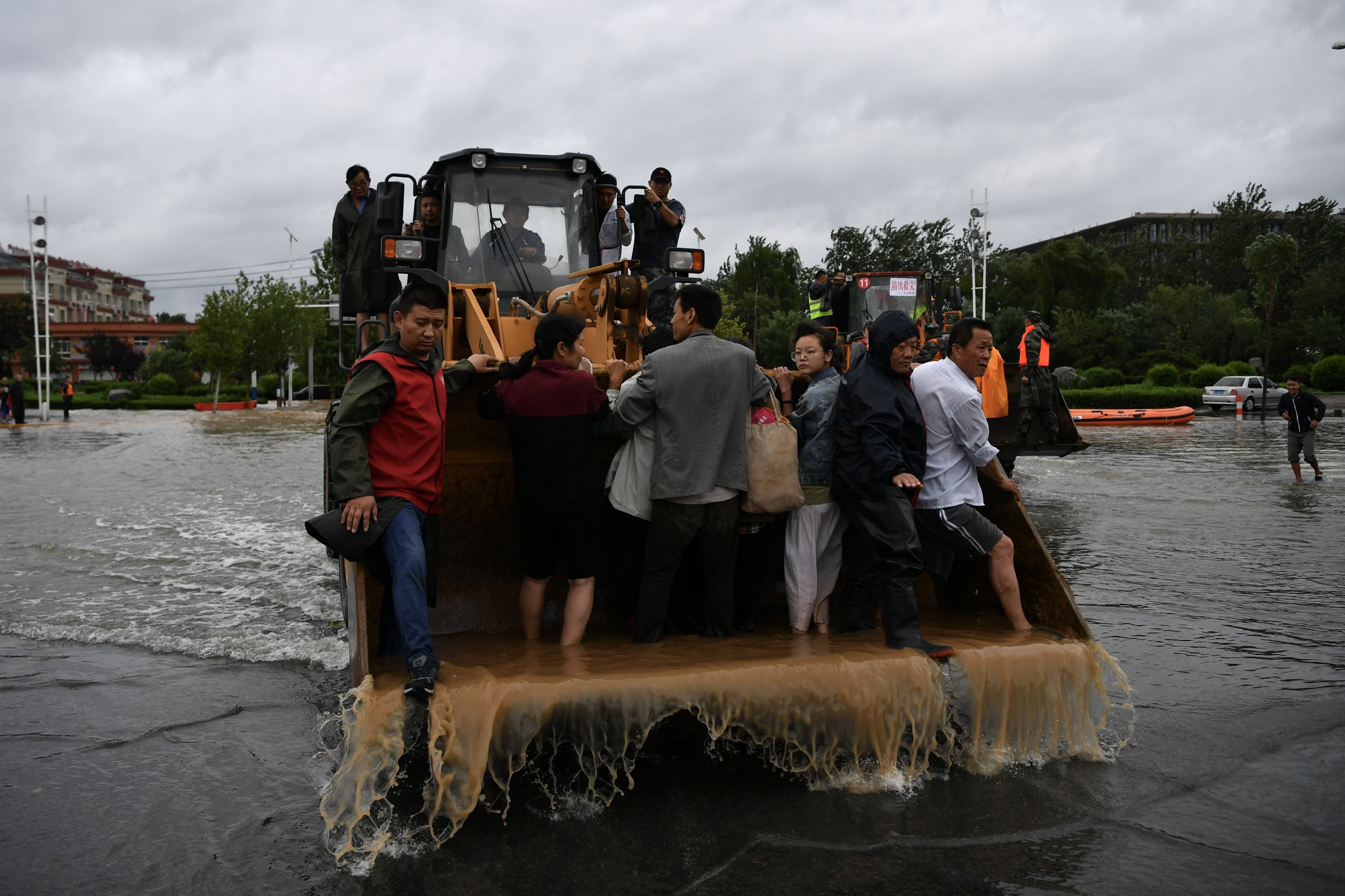 8月12日下午,一台铲车把被困在章丘区相公庄街道的群众安全转运出来。 新京报记者 吴江 摄