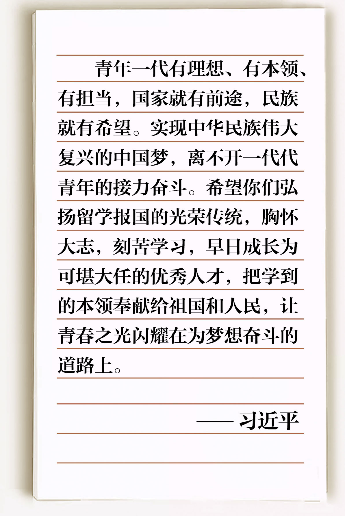 “把学到的本领奉献给祖国和人民,让青春之光闪耀在为梦想奋斗的道路上。”习近平主席对青年学子的热忱勉励,不仅为海外学子们指明了人生航向,也影响和改变了许多人的事业选择和价值取向。