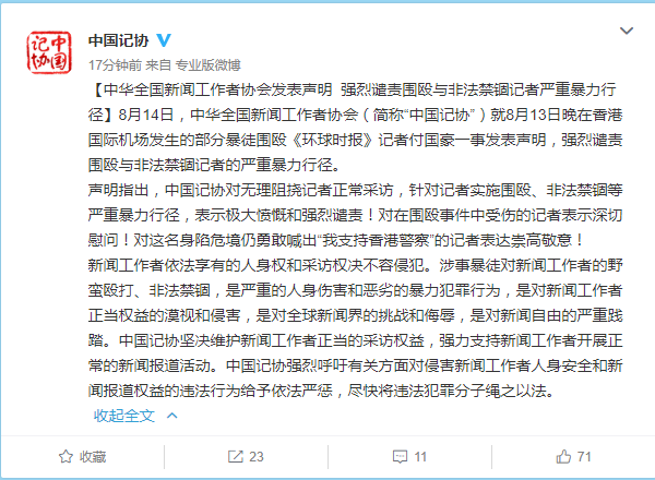 新京报快讯 据中华全国新闻工作者协会官方微博消息,8月14日,中华全国新闻工作者协会(简称“中国记协”)就8月13日晚在香港国际机场发生的部分暴徒围殴《环球时报》记者付国豪一事发表声明,强烈谴责围殴与非法禁锢记者的严重暴力行径。
