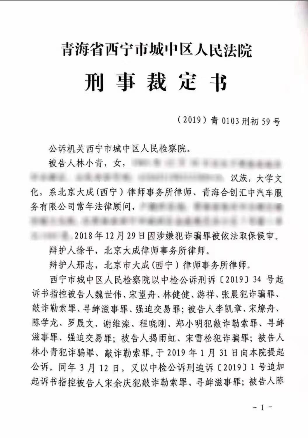 17名被告人中,包括北京大成(西宁)律师事务所女律师林小青。林小青曾为魏某伟等人的青海合创汇中汽车服务有限公司担任常年法律顾问,被控诈骗罪、敲诈勒索罪,其未认罪。