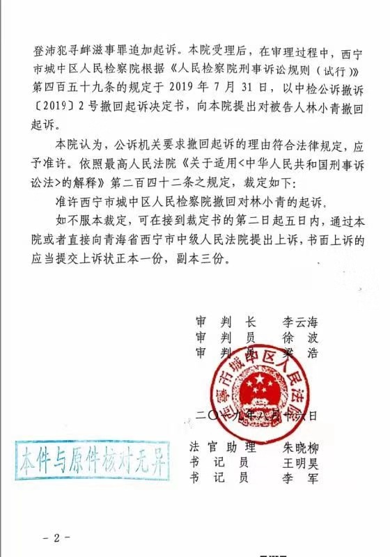 刑事裁定书显示,7月31日,西宁市城中区检察院向法院提出撤回对林小青的起诉。该院认为,公诉机关要求撤回起诉的理由符合法律规定,予以准许。