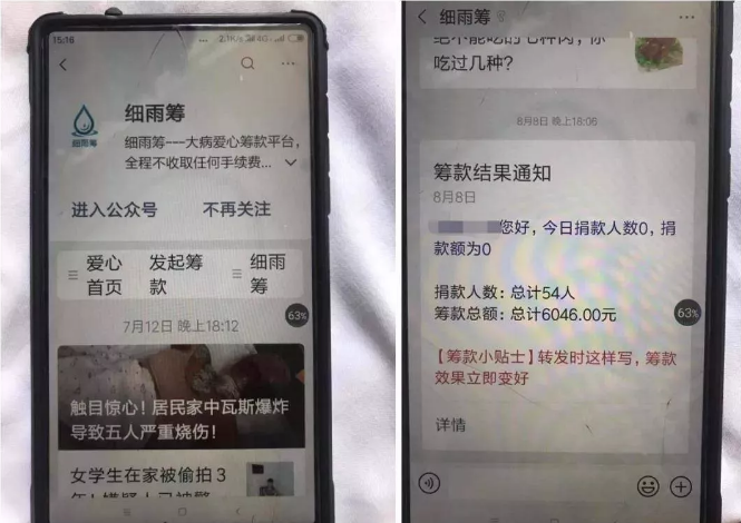 据贵阳晚报报道,今年7月,贵州的何先生被诊断为鳞癌。住院期间,细雨筹志愿者邀请他通过该平台募集善款,共筹到6046元。但他在提取时发现,之前的捐款链接已经点不进去,“细雨筹”公众号打不开,志愿者也联系不上。同样着急等待“救命钱”的,还有王先生。他的两个儿子被烧伤,在细雨筹平台筹集到了1万1千多元善款,至19日中午也一直取不出来。