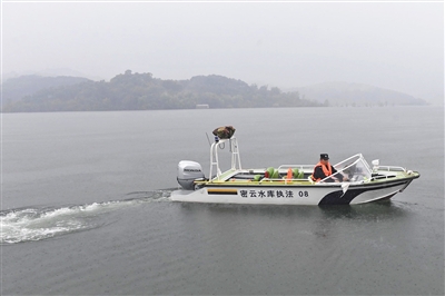 在昨天的蒙蒙细雨中,密云水库烟波浩渺,仿佛罩上了一层薄纱。“虽然雾气有点浓重,但是有了它,我们照样能安全执法。”密云水库综合执法大队队员魏玉杰指着新能源执法船说。