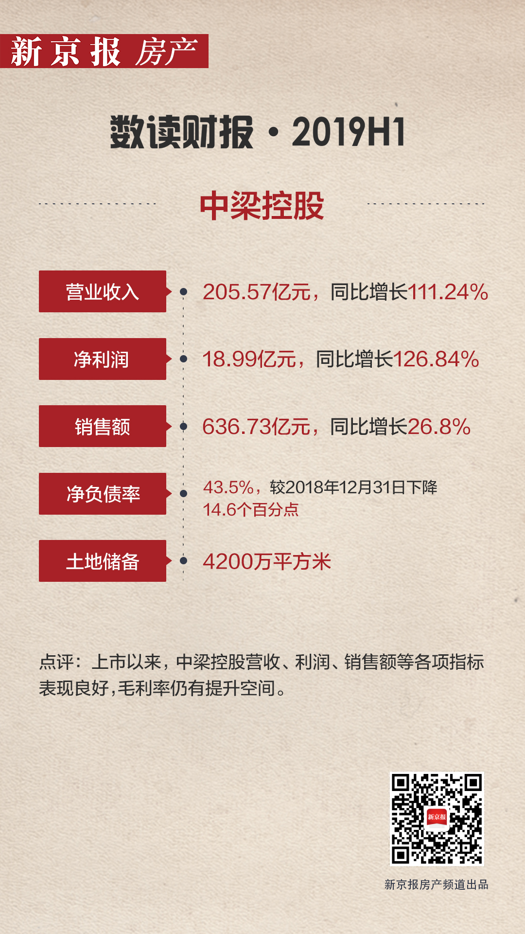 在偿债能力方面,截至2019年6月30日,中梁控股的权益总额约为93.88亿元,借款总额约为288.02亿元,银行结余及现金约为247.21亿元,已收客户按金(合约负债)约为1141.84亿元,净负债率约为43.5%,较2018年12月31日下降约14.6个百分点。期内加权平均债务成本10.0%,较2018年12月31日上升0.1个百分点。