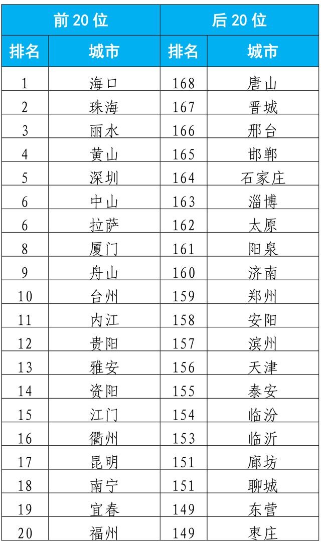 2019年7月168个重点城市排名,前20位和后20位城市名单。图片来源:生态环境部
