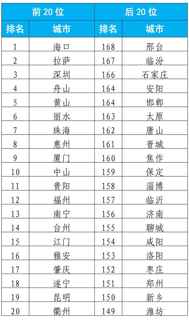2019年1-7月,168个重点城市中邢台、临汾、石家庄市等20个城市空气质量相对较差(从第168名到第149名);海口、拉萨、深圳市等20个城市空气质量相对较好(从第1名到第20名)。