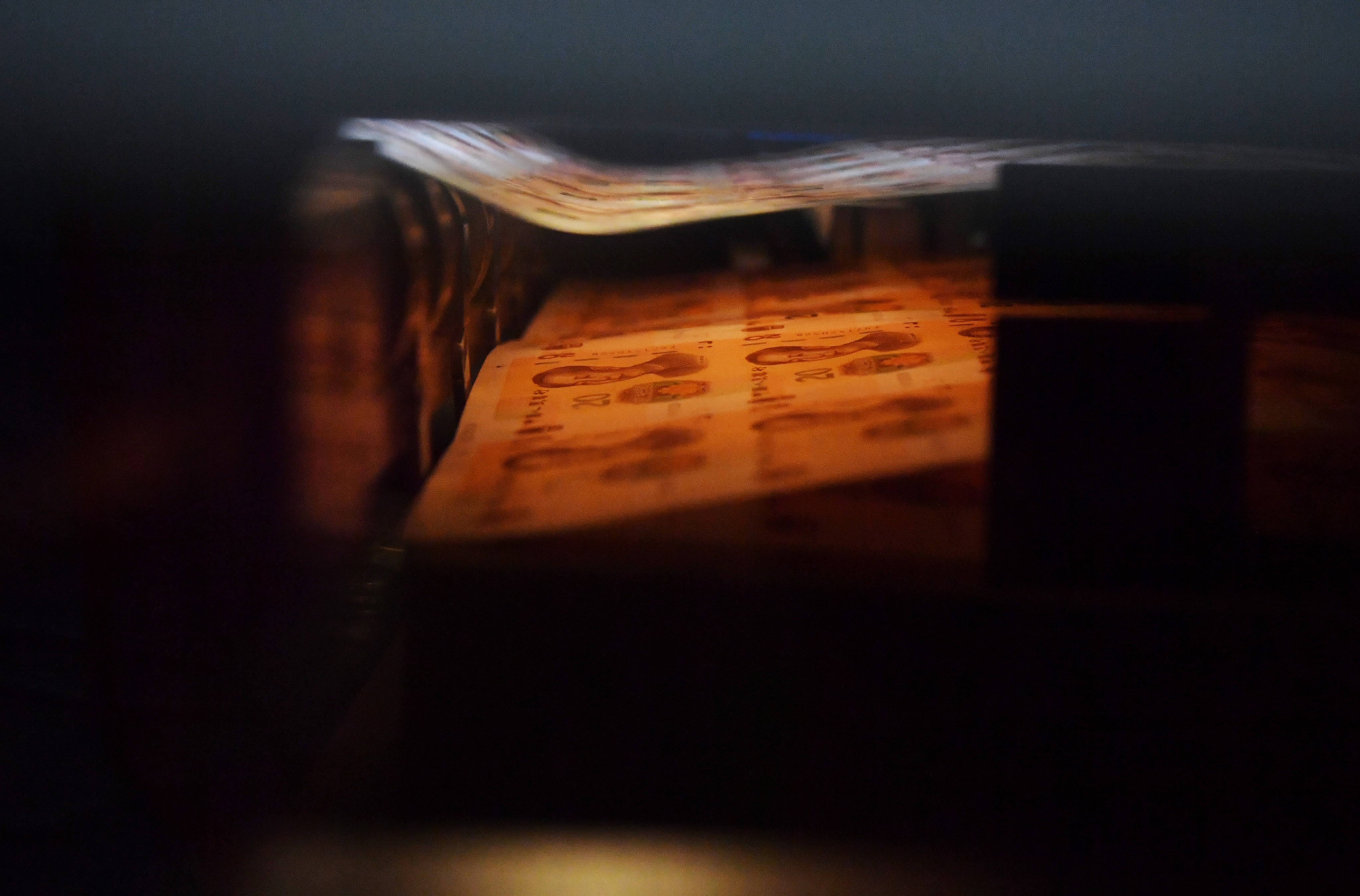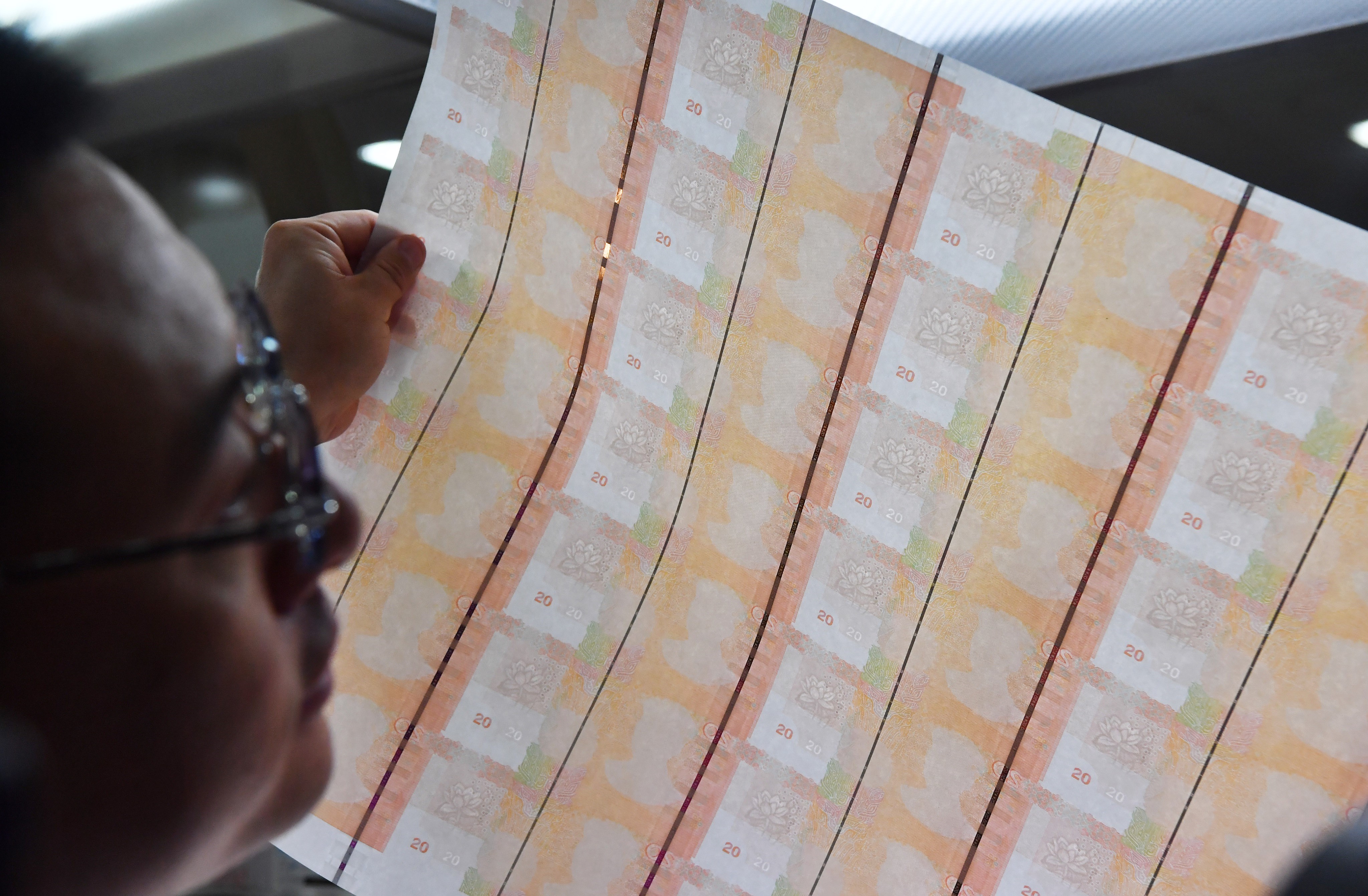 印钞的第一道工序是胶印,这道工序中主要完成钞票正背面底纹图案的印刷。通过鲜亮、精美的底纹图案,赋予钞票特定的色彩美感。工人在检查胶印后的整版钞票。