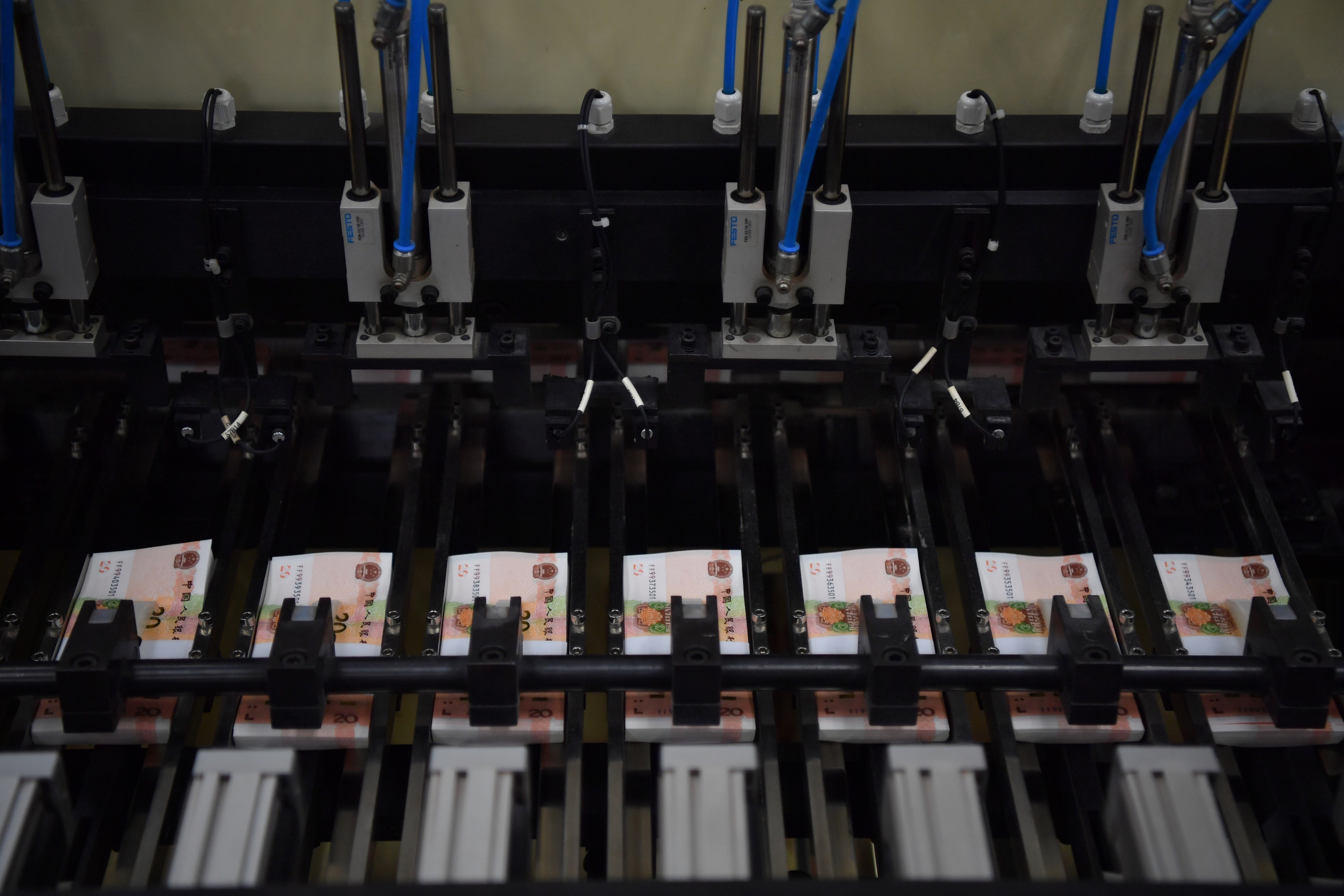 在石家庄印钞有限公司裁封车间,工作人员在整理20元大张产品。
