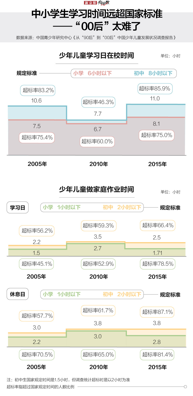 中国青少年研究中心曾先后于2005年、2010年和2015年在全国十个省市进行了三次“中国少年儿童发展状况调查”,即“90后”、“95后”和“00后”代际比较。结果显示,“00后”的学习负担更加沉重,在校时间更长,写作业时间超标严重,上课外班时间显著增加。