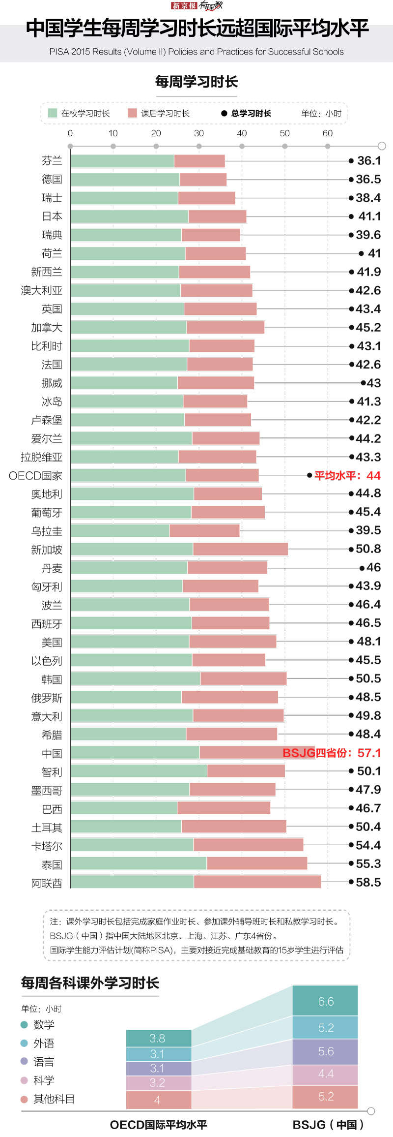 根据国际学生能力评估计划(PISA 2015)的报告显示,中国大陆参加 PISA 测评的北京、上海、江苏、广东四省份学生,平均每周学习时长57.1小时,用于课外学习时间为27小时,在所有参加测评的国家及地区中仅次于阿联酋。