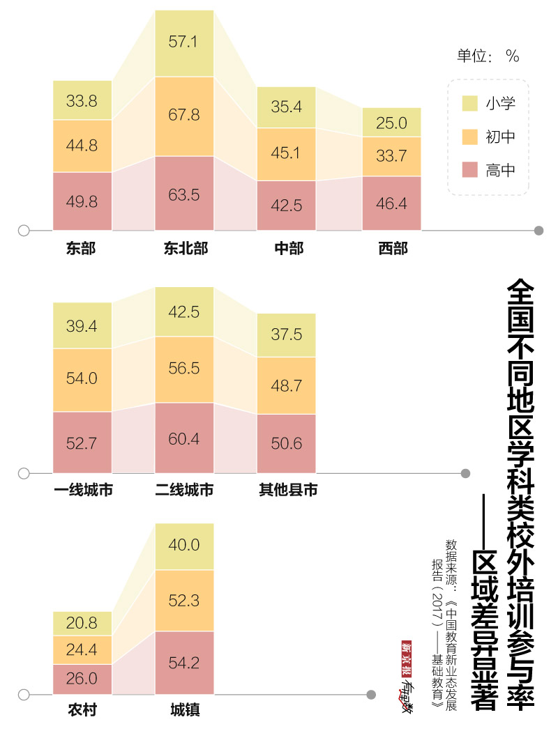 在学科类培训中,不同地区、不同学段的学生学科类校外培训参与率存在着显著差异。