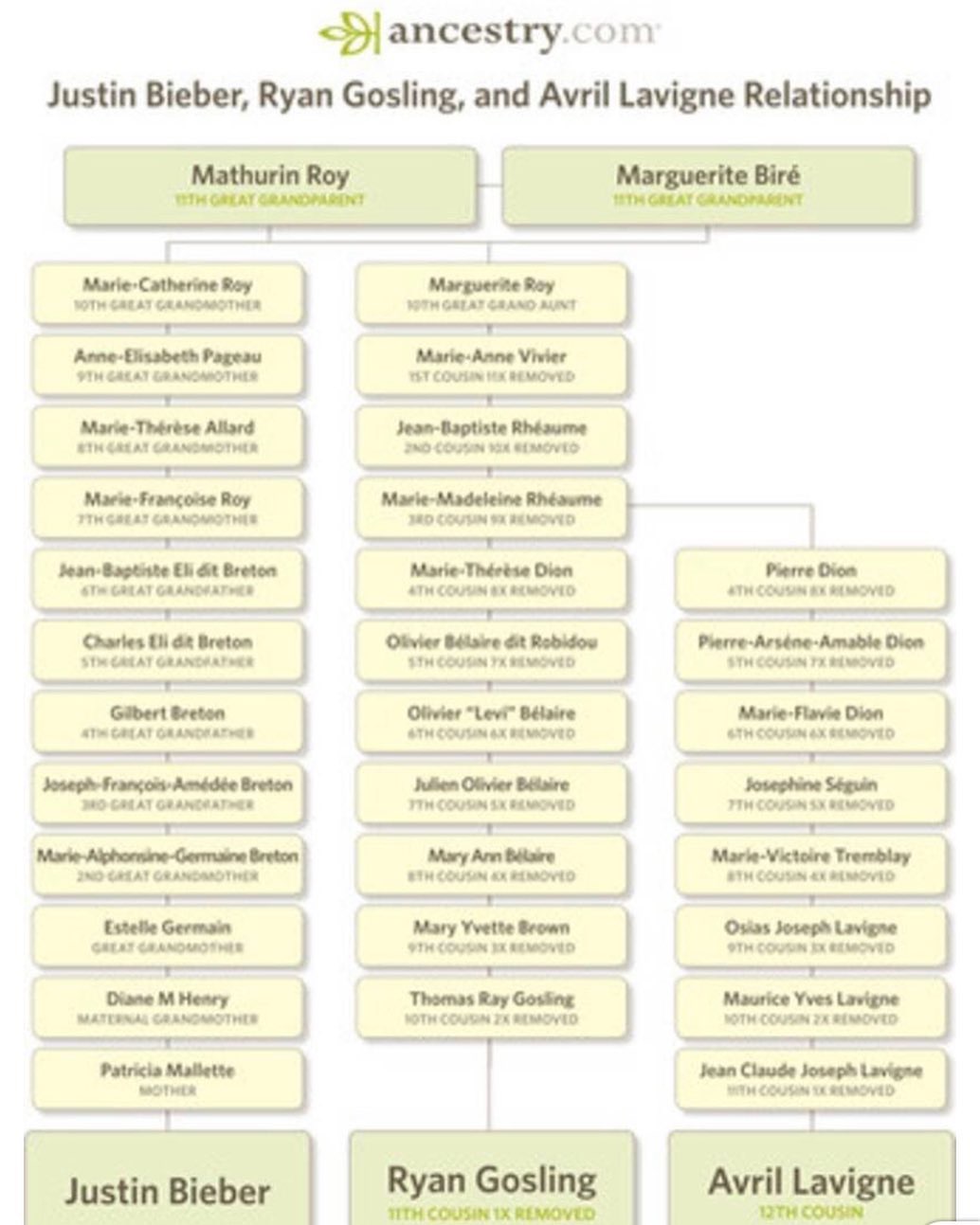 在这张族谱上,显示着比伯与瑞恩·高斯林是隔着11代的表兄弟,与艾薇儿是隔着12代的表姐弟,他们有着共同的祖先。看到此晒图后,艾薇儿还在评论区给比伯留言称:“今年我来组织圣诞晚餐”。