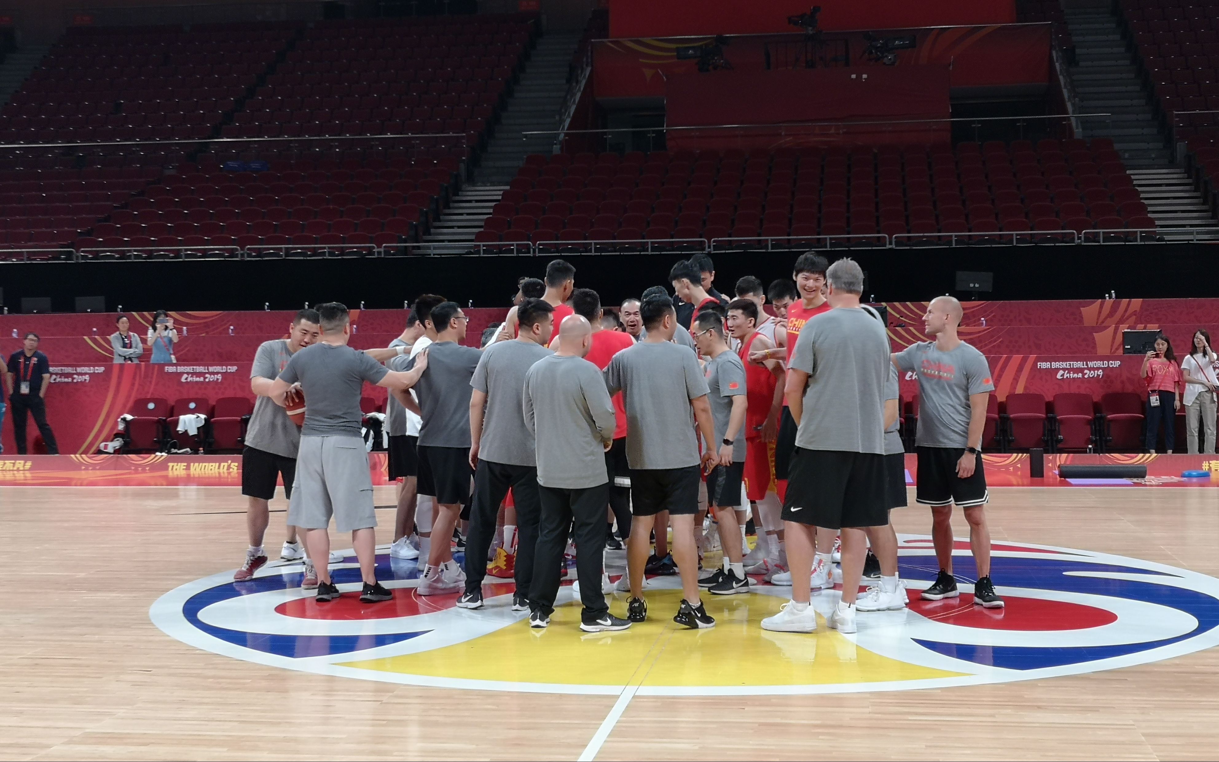 中国男篮在训练结束时围圈打气。新京报记者 徐邦印 摄
