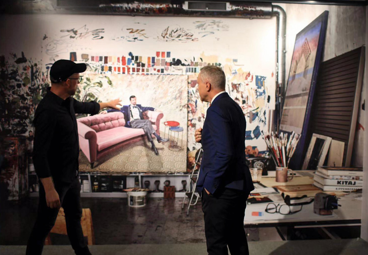 丹麦当代艺术家卡斯帕·埃斯特鲁普(左)给丹麦驻华大使戴世阁(右)介绍作品。