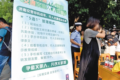 济南市公安局交通警察支队一名工作人员介绍,所谓“五选一”,就是非机动车、行人交通违法被查处时,可以根据自己的意愿自由选择被处罚的方式。具体有:接受由执勤民警开具的简易程序处罚决定书,即受领罚单,交警根据违法者的情节,罚款5元至50元不等;在现场以志愿者的身份执勤体验,劝导不文明交通违法行为15分钟,并签写《我与交警有个约定》守约书;现场手抄非机动车、行人交通安全“十不准”法规条文,几句话写出个人认识和体会,并签写《我与交警有个约定》守约书;现场观看非机动车、行人交通事故警示教育视频,并签写《我与交警有个约定》守约书,大约20分钟;按照交管部门提供的提纲,编写微信,并转发个人的朋友圈,集赞20个以上,同时签写《我与交警有个约定》守约书。