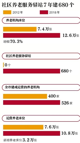 从2012年至2018年,全市建成运营的养老机构数量从400家增长至526家,养老服务商达到近2万家;运营养老床位从7.6万张增长至10.8万张,新增养老床位3.2万张,年均增加5000余张,70%以上养老床位由社会力量建设或运营。