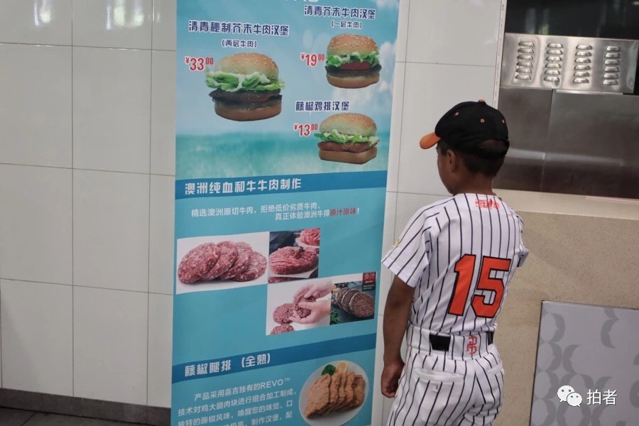 △ 赛后,小队员们来到清华大学食堂就餐,一名队员盯着汉堡包的广告。