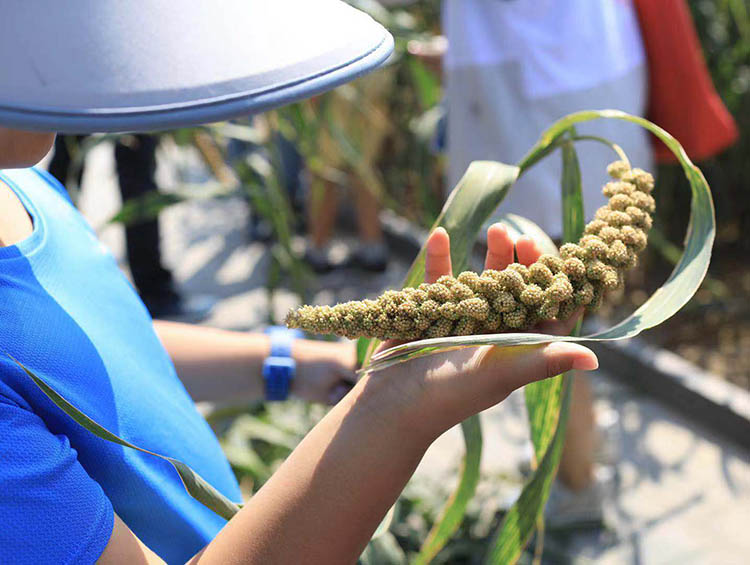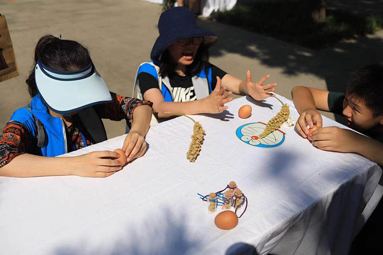 “庆丰收·送祝福”秋收仪式上,邀请十组亲子家庭共同收割今年春耕时在“一亩三分地”种下的黍,体验收获的乐趣。除了收割谷穗之外,还设了体验区,包括谷子生长图鉴的科普展览、赠送《秋牛图》、竖鸡蛋比赛、草编蚂蚱、吹糖人和送祝福等活动。