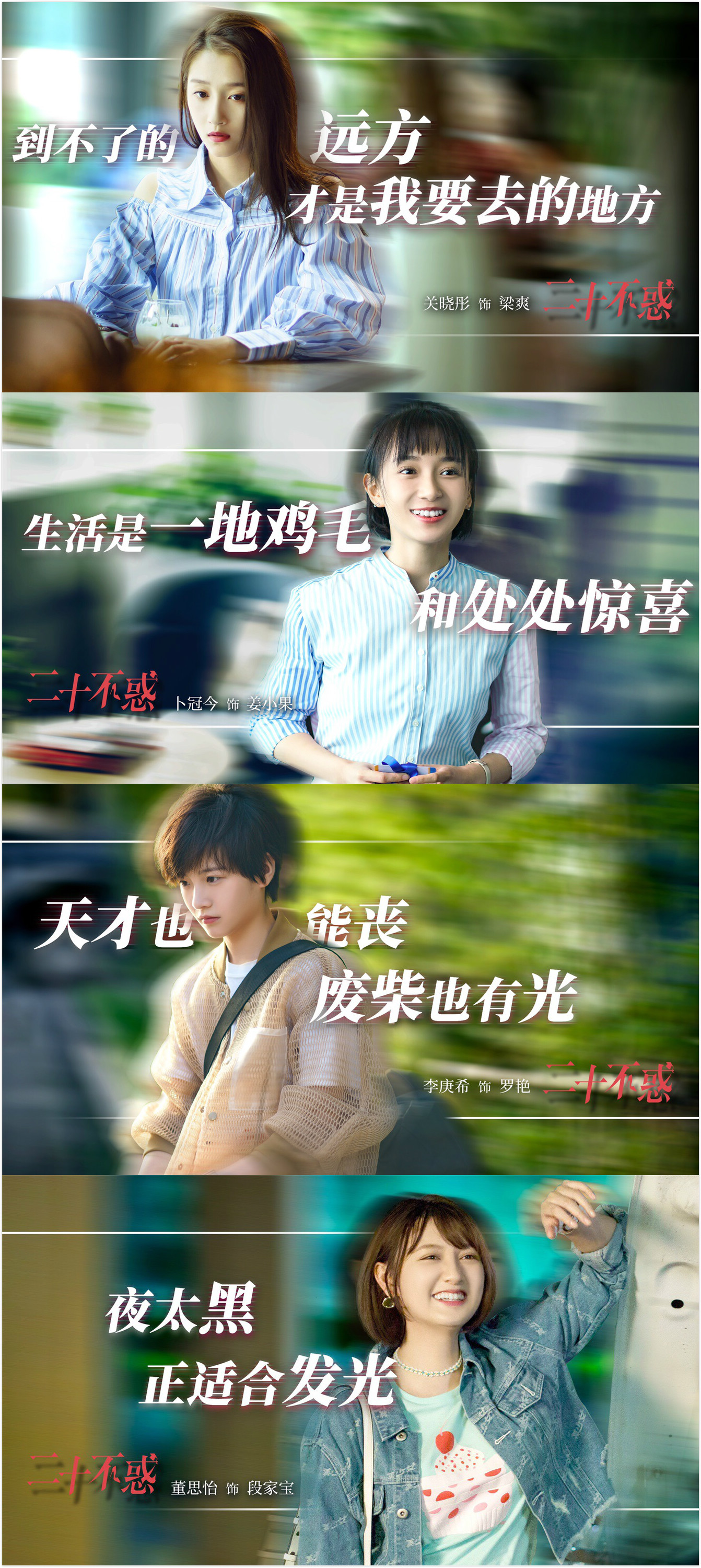 在“态度版”海报中,九位主演一一亮相。关晓彤饰演的梁爽清冷的眼神似乎有着太多的“不满足”,文案中“到不了的远方才是我要去的地方”彰显其蓬勃十足的野心。“生活是一地鸡毛和处处惊喜”诠释了卜冠今饰演的姜小果,天生的乐观与自信,她能笑对一切。李庚希饰演的罗艳虽表情不悲不喜,但若有所思的眼神暴露了其心中的想法,正所谓哪怕是“废柴”也想要发出属于自己的微光。董思怡饰演的段家宝靠在车上爽朗大笑,笑容坚定而自信。四个女孩的海报呈现了不同的心理状态,她们坚持自我,还原“二十不惑”的青春态度。其中,梁爽性格傲娇叛逆,爱打扮爱美妆,与关晓彤近几年的形象十分贴合;罗艳宅女附身,恐社交有网瘾,与李庚希之前在《小欢喜》中乖巧的乔英子有极大的反差。