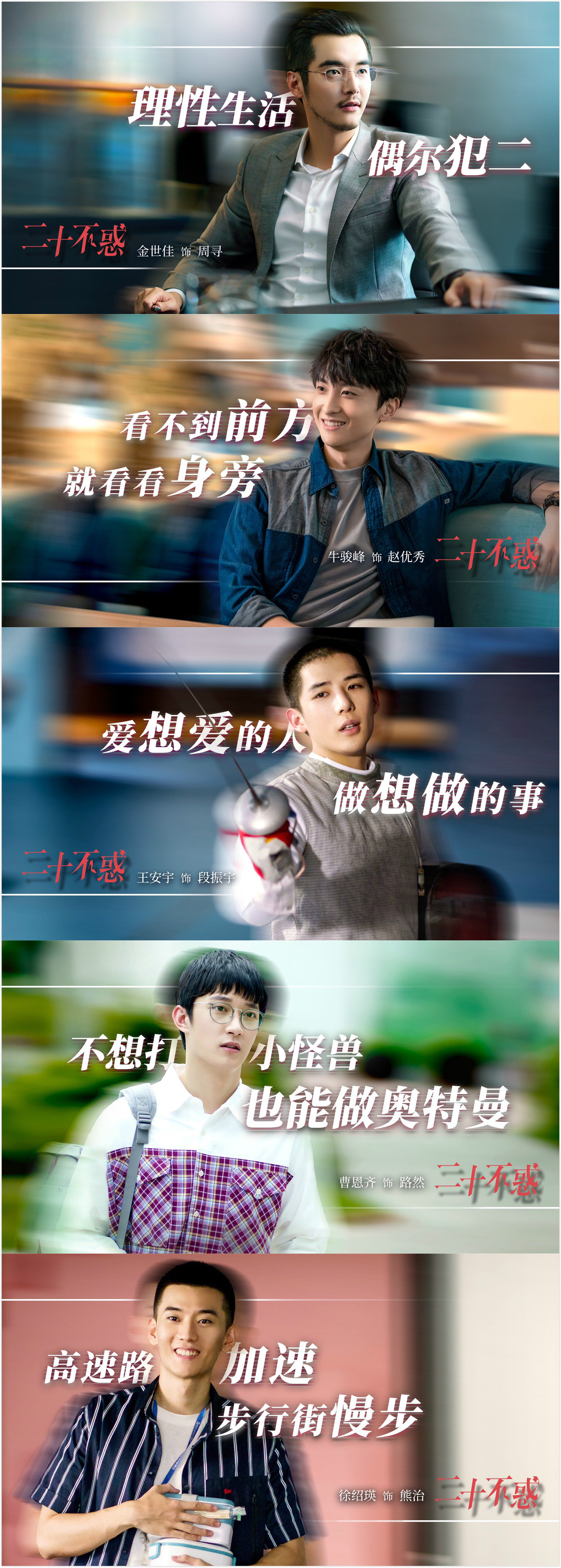 而在首次曝光的男主演中,不同于以往阳光开朗的大男孩形象,金世佳此次饰演了一位成熟睿智的职场boss,海报中他饰演的周寻发型一丝不苟,西装衬衫着身,看上去成熟稳重、充满自信,但“理性生活,偶尔犯二”的态度还是显示出了他内心对洒脱和轻松生活的渴望。牛骏峰饰演的赵优秀身着深蓝色工装衬衫外套,一脸轻松,潇洒朗笑。王安宇饰演的段振宇剑服加身,“爱想爱的人,做想做的事”的人生态度也从侧面突显出他的自信和从容。曹恩齐饰演的路然文静瘦弱,大学学长的模样得体且自然。而徐绍瑛饰演的熊治清爽帅气,治愈系的笑容看起来温暖又阳光。