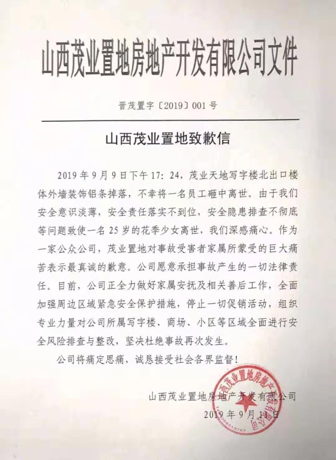 新京报讯(记者 张建)昨天,有媒体报道,“9月9日下午5时左右,山西太原茂业天地写字楼发生一起高空坠物事件,一名25岁女子被坠物砸倒身亡。”今天,山西茂业置地房地产开发有限公司(简称“山西茂业置地”)茂业百货分公司(简称“茂业百货”)微信公众号发布山西茂业置地致歉信。在致歉信中,山西茂业置地表示,愿意承担事故产生的一切法律责任,对公司所属写字楼、商场、小区等区域全面进行安全风险排查与整改。