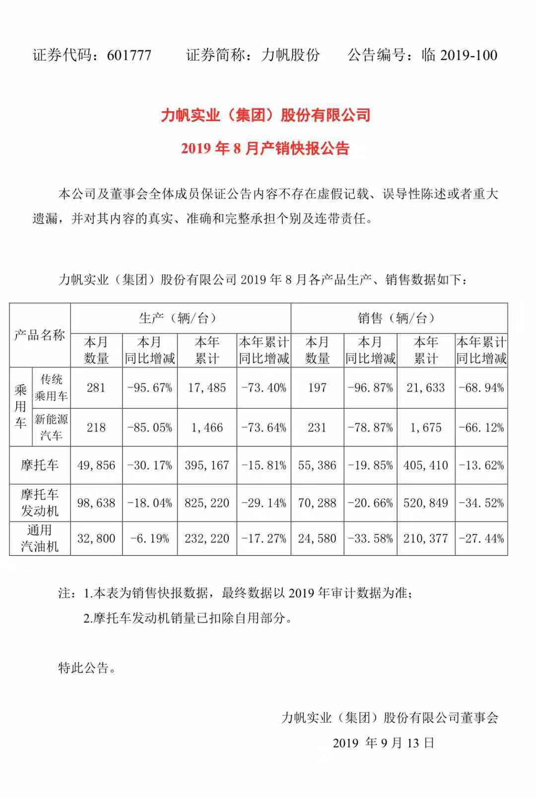 新京报讯(记者 张冰)9月12日晚,力帆股份披露的产销快报显示,8月传统乘用车销量为197辆,同比下降96.87%;1-8月,传统乘用车销量为2.16万辆,同比下降68.94%。新能源汽车方面,8月销量为231辆,同比下滑78.87%;前8个月共售出1675辆,同比下降66.12%。