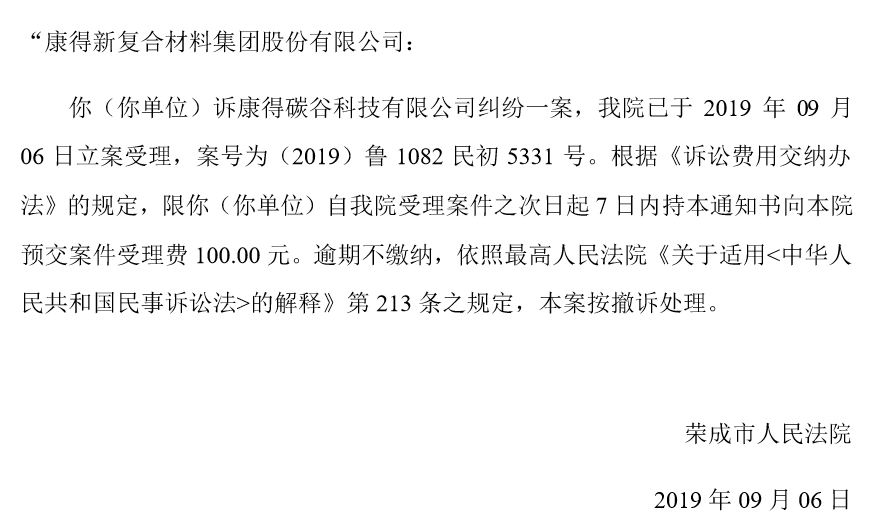9月15日,康得新公告表示,公司于2019年9月12日收到荣成市人民法院出具的《预交案件受理费通知书》。《预交案件受理费通知书》具体内容如下: