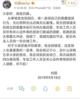 18日早上,刘露发文道歉称,自己内心无比煎熬无比后悔无比羞愧,向办案民警、车站工作人员及所有关心这件事的朋友们真诚地道歉,将深刻反省自己。而据了解,刘露出事之前正在拍摄网剧《时光与你都很甜》。