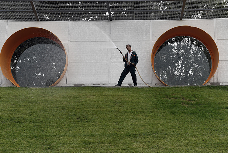 园区墙上开了一排巨大的圆洞,铁皮卷嵌在洞里。