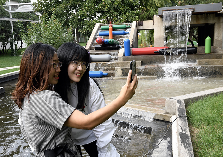 天海科技广场,人们在五颜六色的氧气瓶景观前合影。这里原来是生产气瓶的厂区,在改造过程中,类似的工业遗存被保护和再利用。