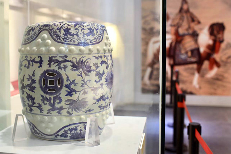 一期修复的青花缠枝莲纹瓷绣墩对外展出。