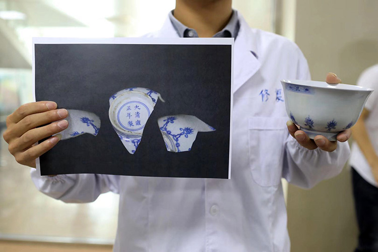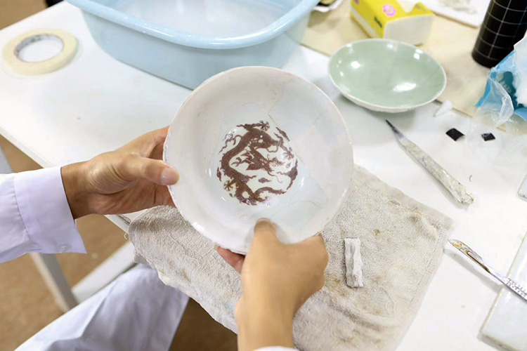 正在修复康熙釉里红龙纹碗。