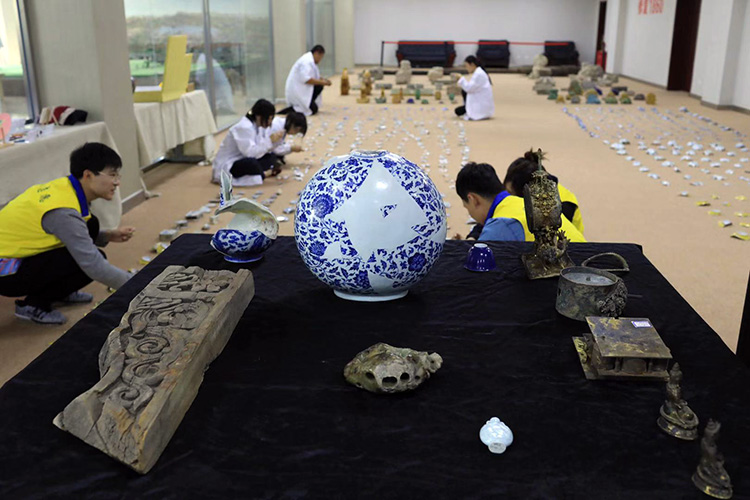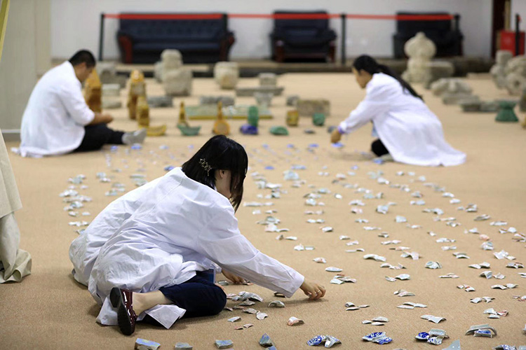 文物修复人员蹲在地上“拼瓷片”。