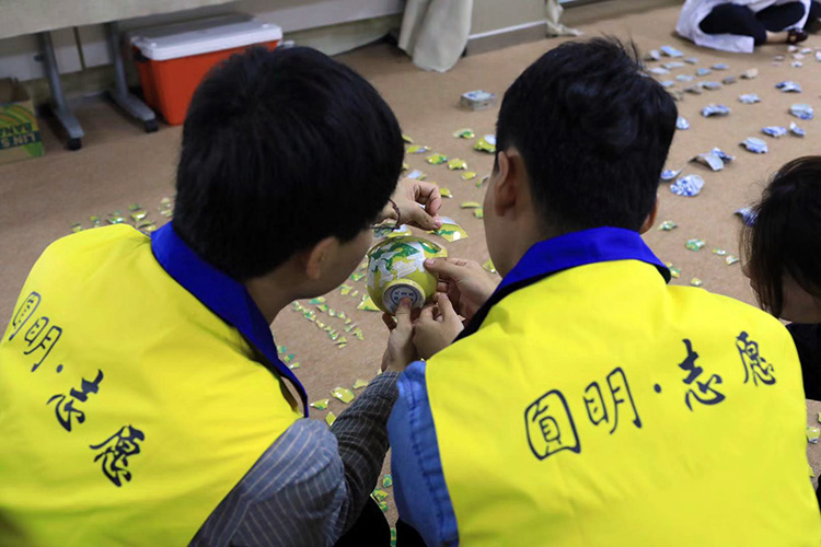 两名大学生志愿者正在查找拼接康熙黄釉绿彩龙纹碗。