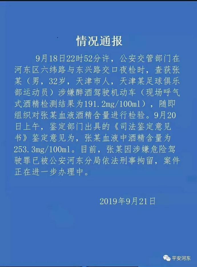 因涉嫌醉驾,天津某足球俱乐部球员张某被刑拘